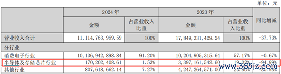 消费类电子业务保持在百亿元规模,尽管去年营收小幅下滑,但营收占比逆升。这一业务2023年营收占比还在57.17%,到2024年上升至91.2%。 深康佳A寄予厚望的第二轮主业——半导体及存储芯片业务遭遇滑铁卢。其营收由33.97亿元大幅缩水至1.70亿元,降幅95%,营收占比由约20%降至只有1.53%。 其他业务的营收占比也在下行。