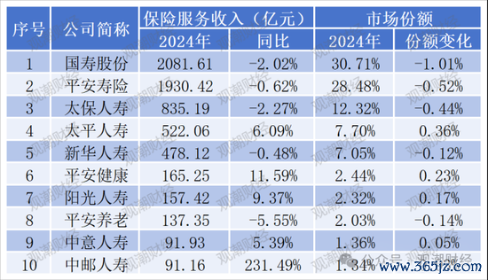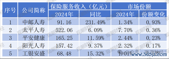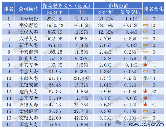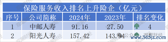 排名上升的2家险企分别为中邮人寿、阳光人寿。其中,2024年中邮人寿保险服务收入上升至91.16亿元,即将跻身“百亿俱乐部”。