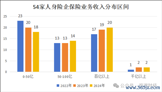 从保险业务收入为披露口径的54家险企来看,其保险业务收入集中分布在百亿元以内,占比59%;最近三年超百亿险企数量逐年增加,2024年达20家,占比37%;超千亿险企数量则较稳定,2024年为2家,分别为泰康人寿和人保寿险。