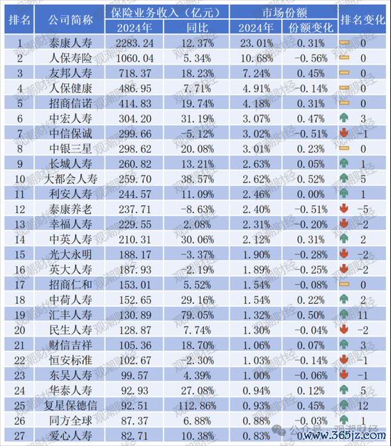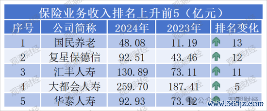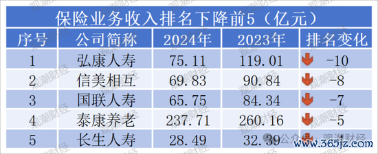 值得一提的是,2024年行业内不少险企状况发生较大变化,仅从排名情况来看,保险业务收入排名下弘康人寿下滑最多,其保险业务收入规模也跌出百亿阵营。