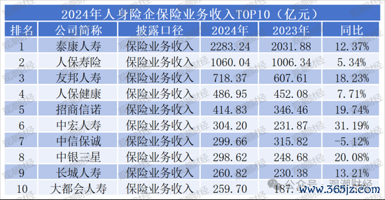 据统计,以保险业务收入为披露口径TOP10中,泰康人寿作为“老五家”中唯一未上市的寿险公司,在该指标统计列中遥遥领先,以2283.24亿元稳居榜首,同比增长12.37%。超同为“老七家”的人保寿险两倍多。