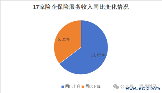 以保险服务收入为披露口径的17家人身险企同比变化占比情况与上述类似,实现保险服务收入正增长的人身险企有11家,占比65%;保险服务收入下滑险企有6家,占比35%。