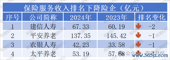 从保险服务收入行业排名变化情况来看,已发布2024年度报告公布保险服务收入的17家人身险企中,有2险企排名上升,4险企排名有所下滑,剩余11家险企排名稳定无变动。