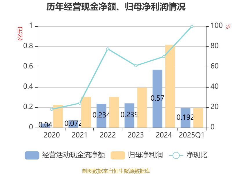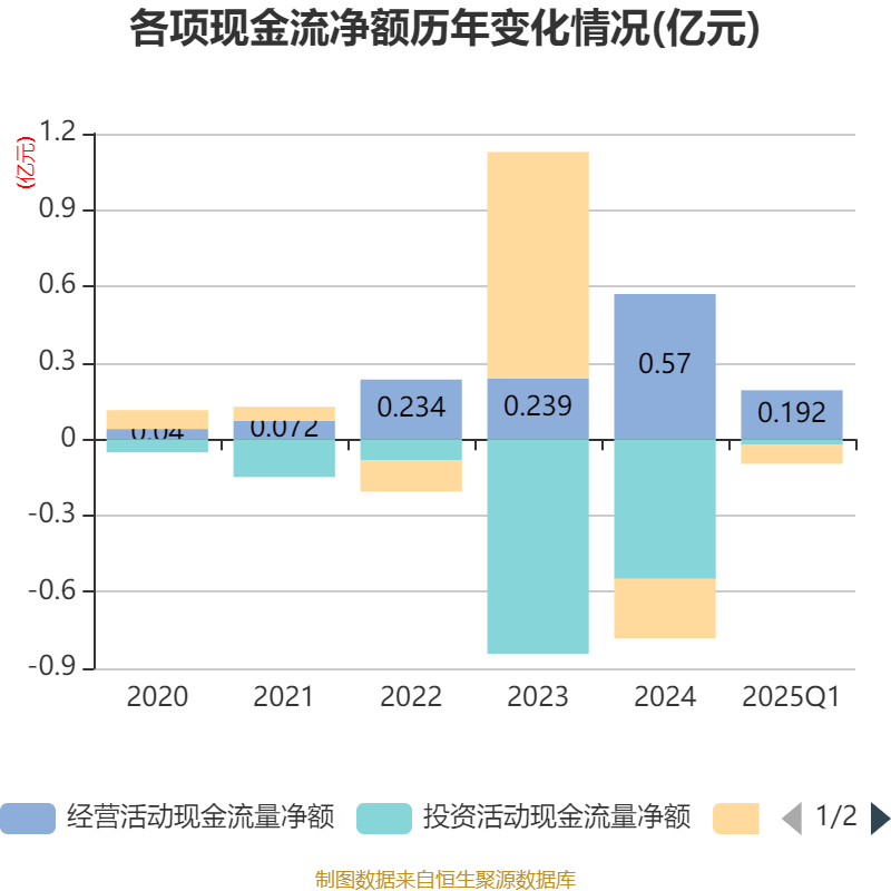 截至2025年一季度末,公司经营活动现金流净额为1915.74万元,同比下降51.45%;筹资活动现金流净额-738.3万元,同比减少1090.99万元;投资活动现金流净额-228.29万元,上年同期为-6230.07万元。